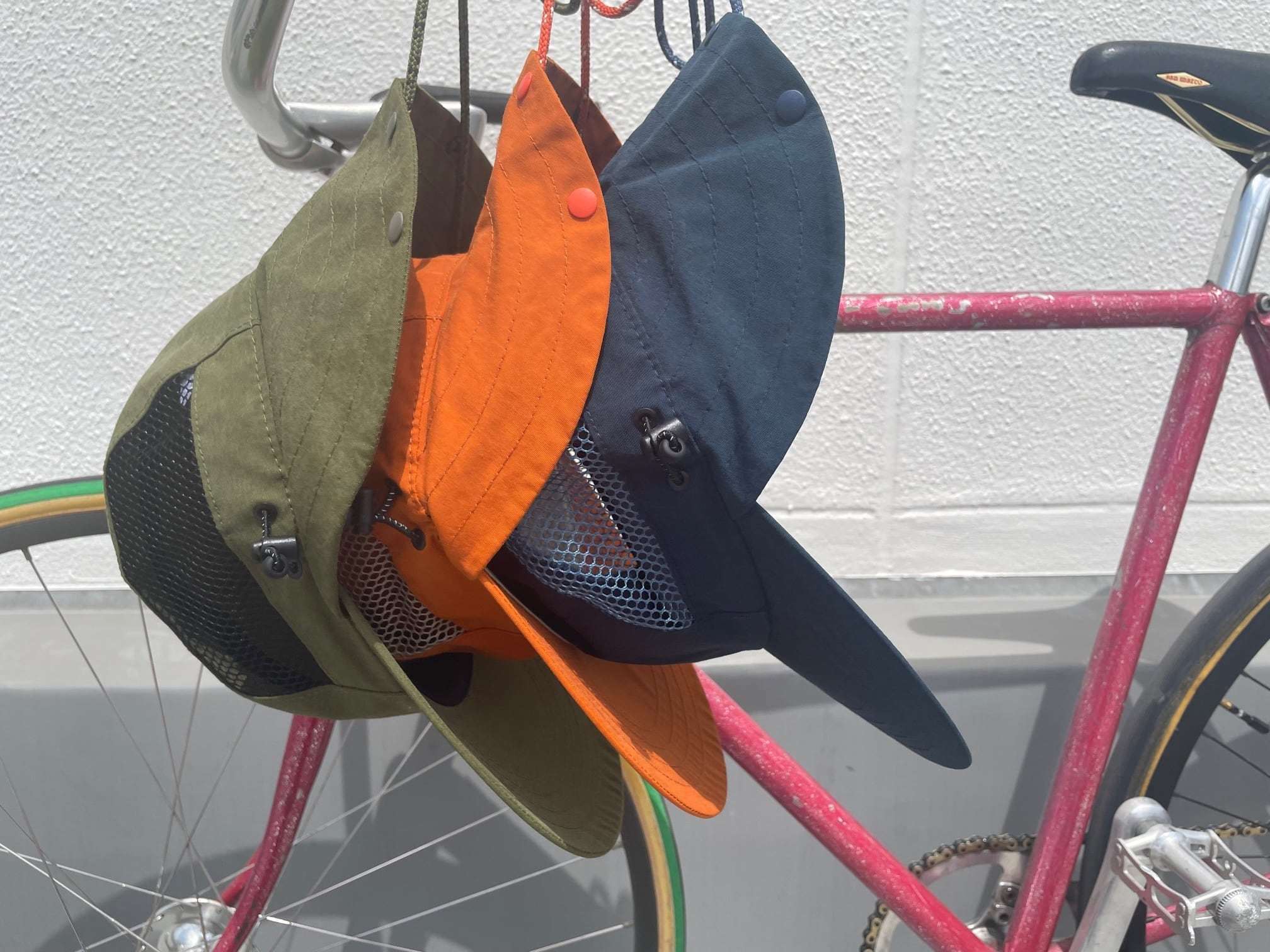ブリムステッチは4本、頭2本ステッチはチェーンステッチ仕上げ、サイド切替メッシュ、後部収納可能なサンシェード。
