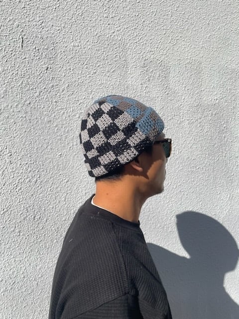 デザイン的には90sぐらいの手編みニット帽をイメージして、それぞれが2色のチェックを半分使いしているのがポイントです。